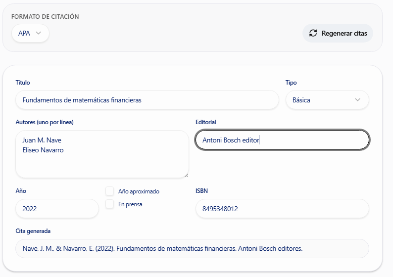 Se hicieron cambios en las bibliografías asignadas, pero no se regeneró la cita, mantuvo el texto de la cita anterior generada, puede quedarse así pero hay que generar un aviso o bien que se regeneren las citas al dar siguiente para que se obtengan los cambios