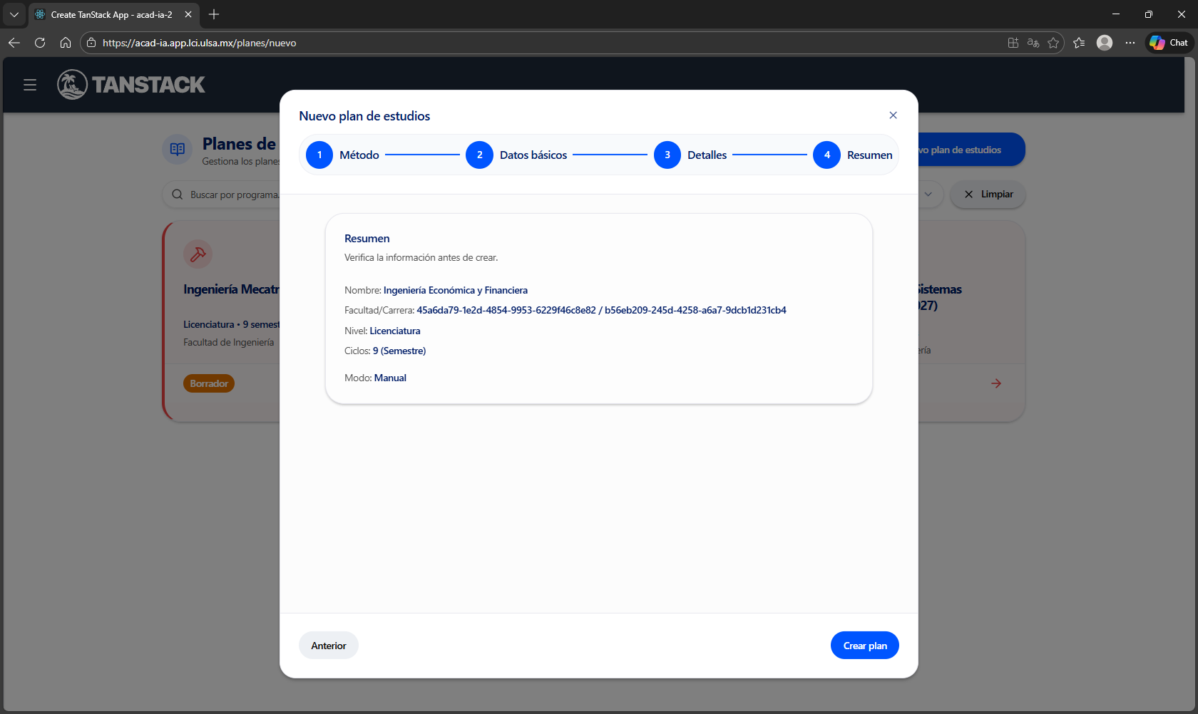 Colocar el nombre de la Facultad/Carrera en el Resumen de la creación de los planes #56