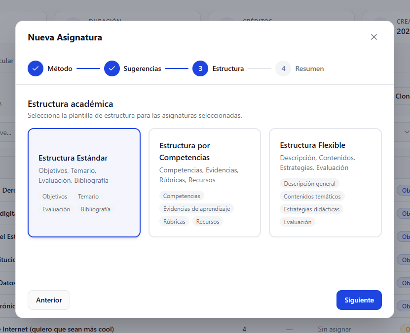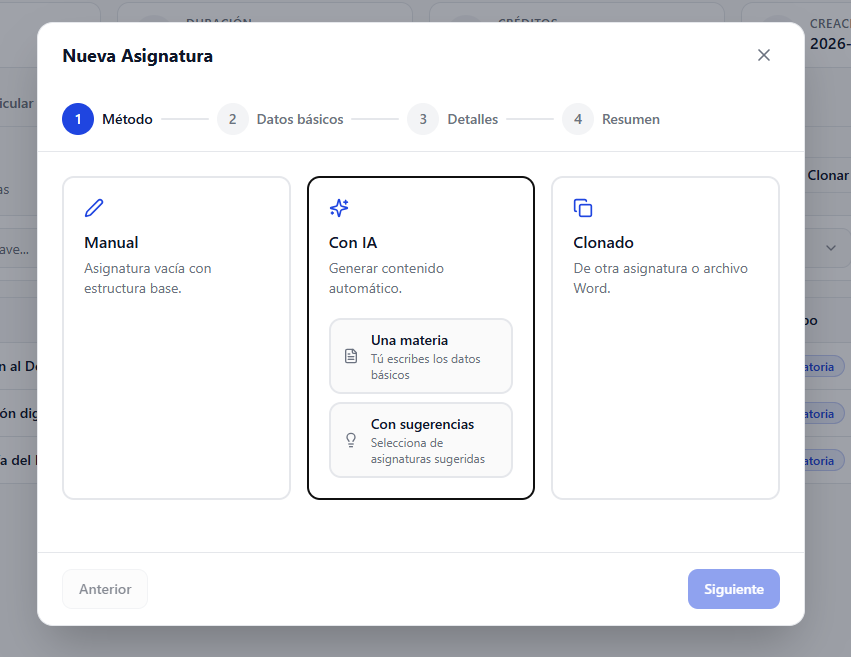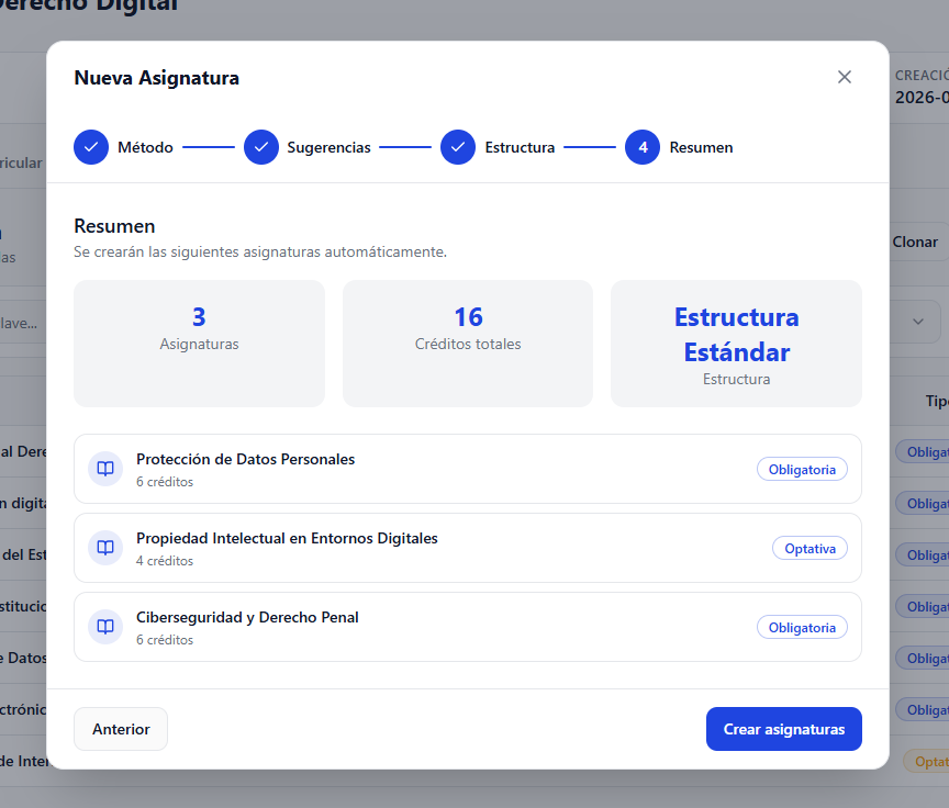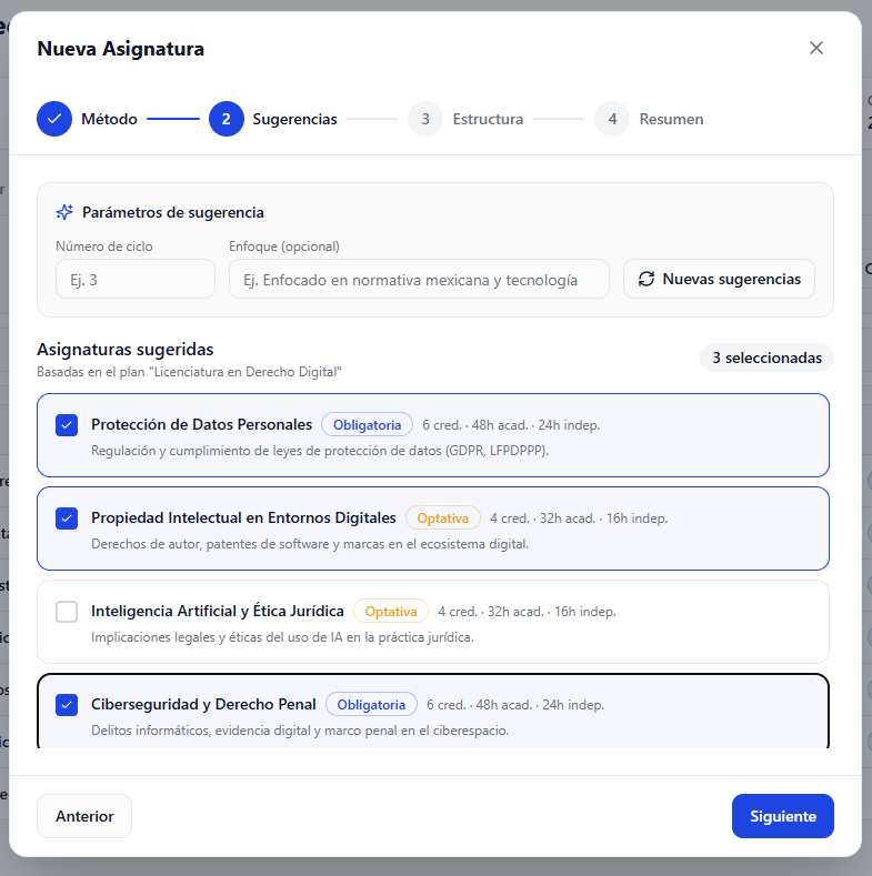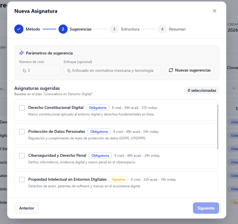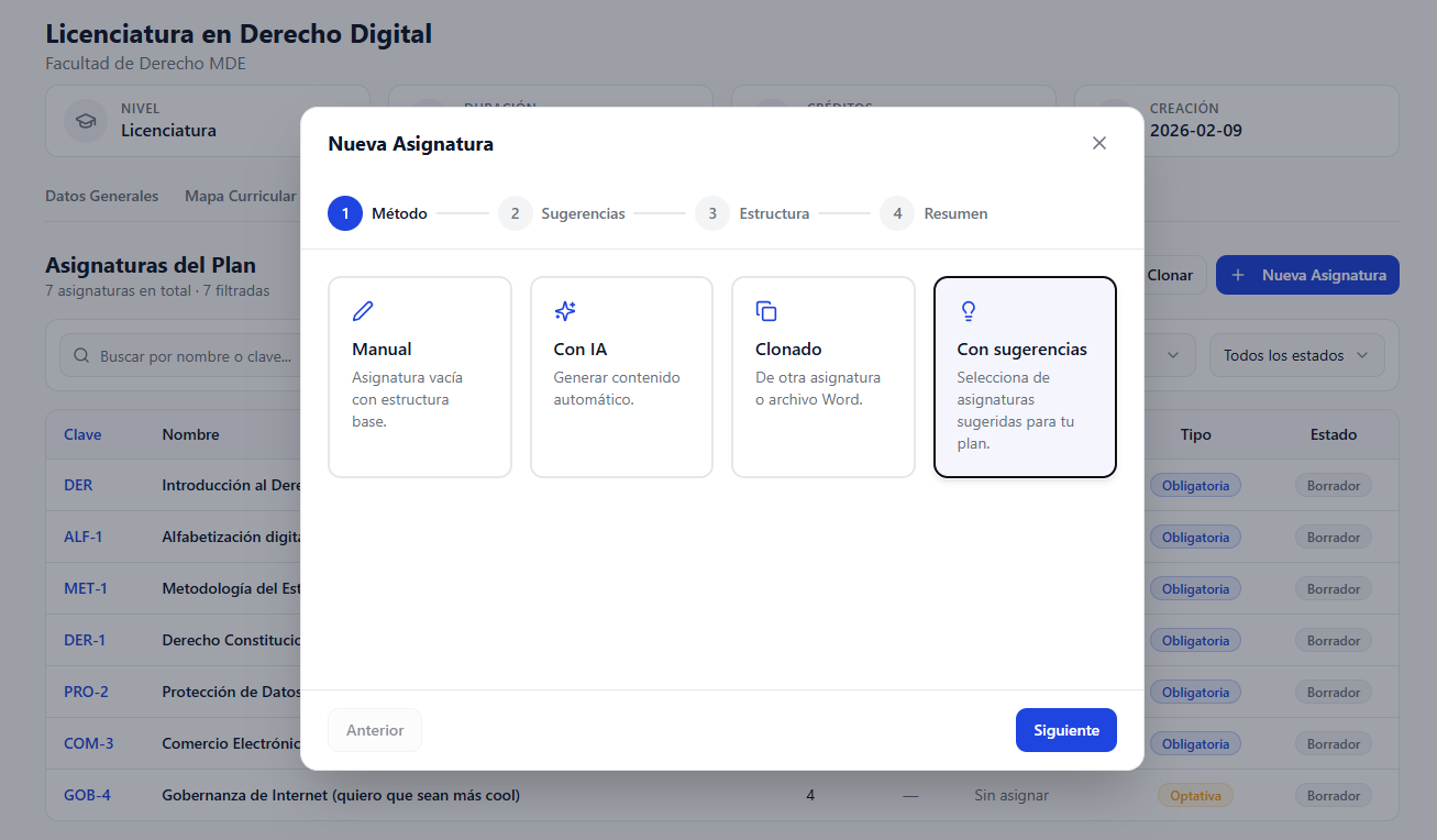 Agregar una nueva opción llamada “Con sugerencias” en el wizard de creación de asignaturas dentro del plan de estudios.